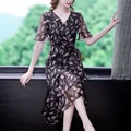 Best savings for 2021 New Summer Women V-Neck Speaker Sleeve Floral Chiffon Long Dress Sweet Ruffles Irregular Hem Mermaid Dress