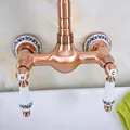 Antique Red Copper Brass Bathroom Kitchen Sink Faucet Mixer Tap Swivel Spout Wall Mounted Dual Ceramic Flower Levers Base mnf954
